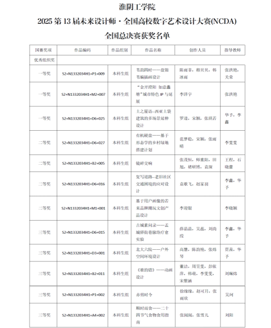 近日,2025第13届未来设计师·全国高校数字艺术设计大赛(NCDA)全国总决赛获奖名单已揭晓。我校设计艺术学院学生参赛作品斩获全国等级奖项12项,其中一等奖3项、二等奖4项、三等奖5项,另获省级奖93项,我校获优秀组织奖。充分展现了学校在艺术设计领域的办学水平与人才培养质量。