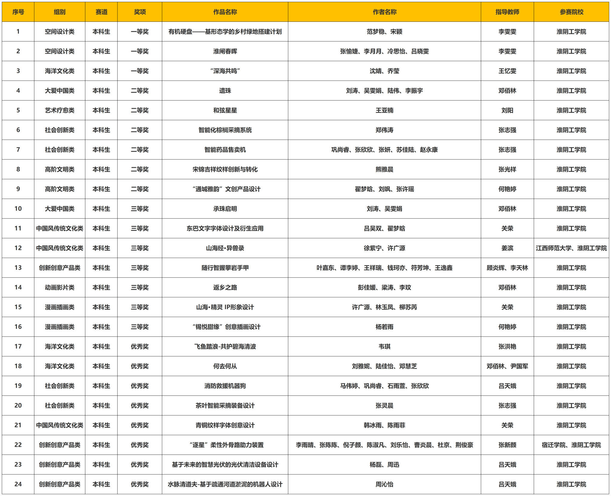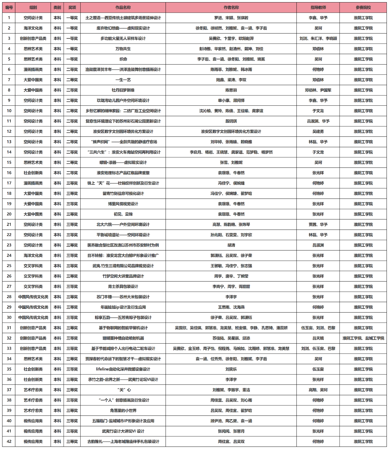 经过激烈的省赛和国赛角逐,设计艺术学院在本次比赛中斩获全国等级奖项42项,其中一等奖5项,二等奖11项,三等奖26项,另获省级等级奖24项。