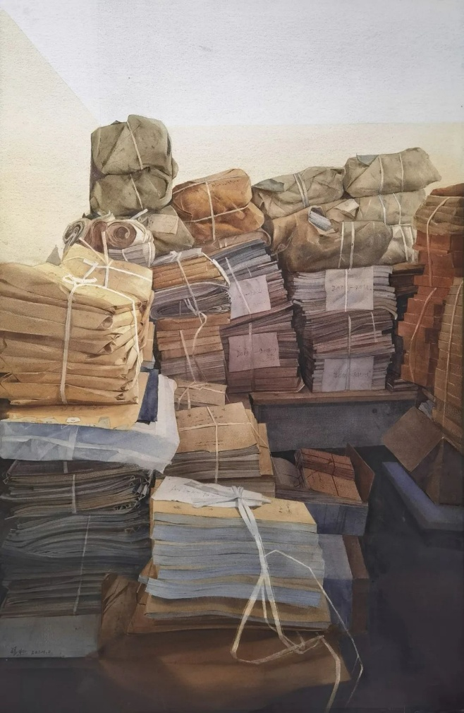 《积淀》是一幅以堆积如山的档案资料为题材的艺术作品,素材来源自淮阴工学院2018年设计艺术学院搬迁时期归档的一堆文件资料。通过展示这些被整理、捆绑并保存下来的资料,旨在传达历史的厚重感和时间的流逝。作品表达了对过去的敬意,同时也强调了记录和保存历史的重要性。每一捆资料、每一个档案都代表着一个个鲜活的故事、一段段珍贵的记忆,折射出岁月的积累和知识的传承。作品通过展现这些积累的资料,呼吁人们珍惜历史,重视记录和传承。
