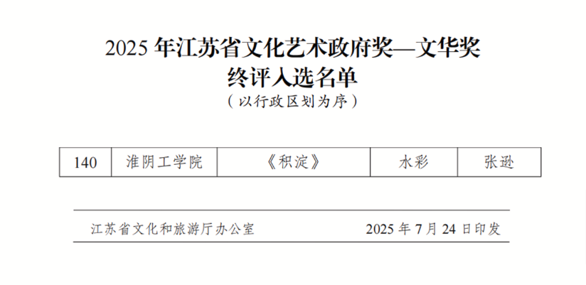 近日,2025年江苏省文化艺术政府奖——文华奖入选名单公布,淮阴工学院设计艺术学院张逊老师创作的水彩作品《积淀》成功入选。