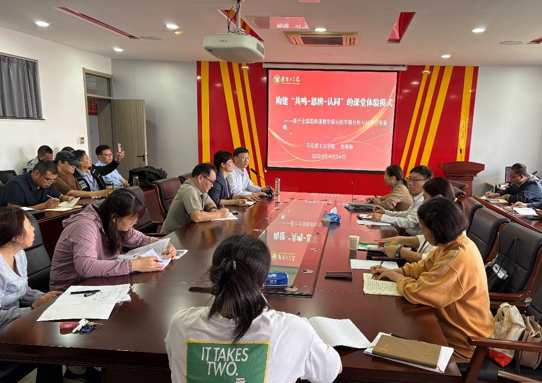 2025年9月24日上午,马克思主义学院在YF0910会议室召开专题教学研讨会,主题为《构建“共鸣-思辨-认同”的课堂体验模式——基于全国思政课教学展示的学情分析与教学实践》。会议由院长施坚主持,副院长张琳琳主讲,全院教师参与。
